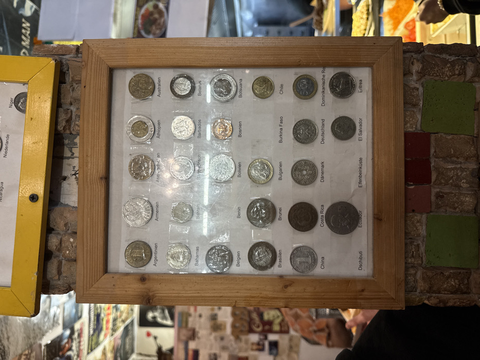 A rectangular wooden frame displays a collection of coins from various countries, each labeled with the country's name