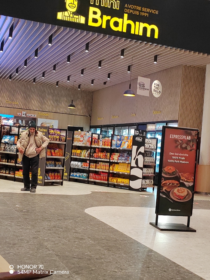 The image depicts the interior of a "Mini Brahim" store, "At your service since 1991." Shelves stocked with groceries and snacks line the aisles. A man stands near the "Tabac" section. Signage includes slogans like "Dare to sip different" and "For the bold." An "ESPRESSOLAB" sandwich advertisement highlights fresh, homemade sandwiches. The lighting is modern, with recessed lights illuminating the store. A "COOL COFFEE" display is also visible. A smartphone watermark "HONOR 70 54MP Matrix Camera" is present in the bottom left corner.