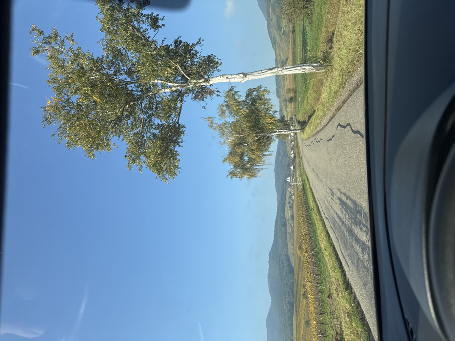 The image depicts a rural landscape near Blienschwiller, France, viewed from inside a vehicle, with a portion of the dashboard visible at the bottom. A single-lane asphalt road, exhibiting multiple linear and serpentine cracks, recedes into the mid-ground and curves to the right. To the right of the road, a series of deciduous trees, likely birch, with prominent white-grey bark and green-yellow foliage, are situated on a grassy verge. Beyond these trees, a green field extends. To the left of the road, cultivated vineyards with yellow-green leaves extend across the terrain towards the distant background. A small village, characterized by light-colored structures and dark roofs, is partially visible through the vineyards in the mid-ground, accompanied by a white triangular road sign with a red border. The horizon features rolling, forested hills under a clear blue sky with faint wispy clouds. The scene is illuminated by direct sunlight, casting shadows on the road. No human figures or other vehicles are present within the observable road or immediate environment.
