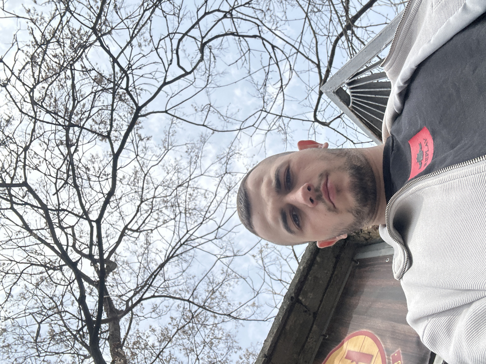 A young adult male is depicted in a low-angle, head-and-shoulders portrait shot within an outdoor urban setting. The subject has a closely cropped haircut and light facial stubble, maintaining a direct gaze towards the camera with a neutral expression. He is dressed in a light grey, ribbed, zip-up jacket over a black t-shirt which features a red rectangular patch with an indistinct graphic and the brand name "REPLAY" printed below it. To the subject's immediate left, a portion of a weathered wooden structure or wall is visible, on which a partially obscured yellow and red circular sign is affixed. To the subject's right, a dark, triangular or pyramidal metallic structure with radiating fins extends upwards. Overhead, numerous bare tree branches are silhouetted against an overcast, light grey sky. The environment is consistent with an outdoor area in the city of Plovdiv, Bulgaria, though no specific landmarks are visible to pinpoint an exact location within the city. No discernible actions or interactions are taking place.