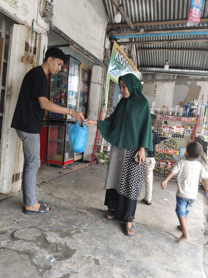 The image displays an outdoor transaction taking place at the entrance of a small shop or kiosk in Palohteungoh, Indonesia