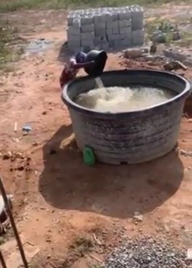 three women carrying buckets of water on their heads to a large water tank on a dirt lot in a partially developed rural area. The first woman is pouring her bucket of water into the tank. Behind her, two other women are walking toward the tank, each carrying a bucket on their head. The tank is filled with water, and there are stacks of concrete blocks nearby. Metal reinforcing bars are also visible in the foreground. The area is grassy with scattered trees and a small mountain in the distance.