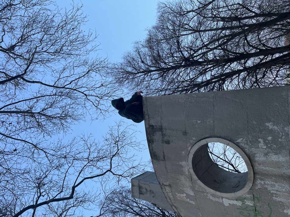 A lone individual is observed crouched atop a weathered, grey concrete structure with a prominent circular opening. The person is dressed in dark green hooded attire, with the hood pulled up and obscuring their face. The concrete structure exhibits discoloration and some visible graffiti near the circular opening. This structure is identified as part of the Monument of the Fallen Partisans, located in Svoboda Park, Pazardzhik, Bulgaria. The background features a clear, light blue sky, heavily populated with the bare, intricate branches of numerous leafless trees, indicative of late autumn or winter conditions. Natural daylight illuminates the scene.