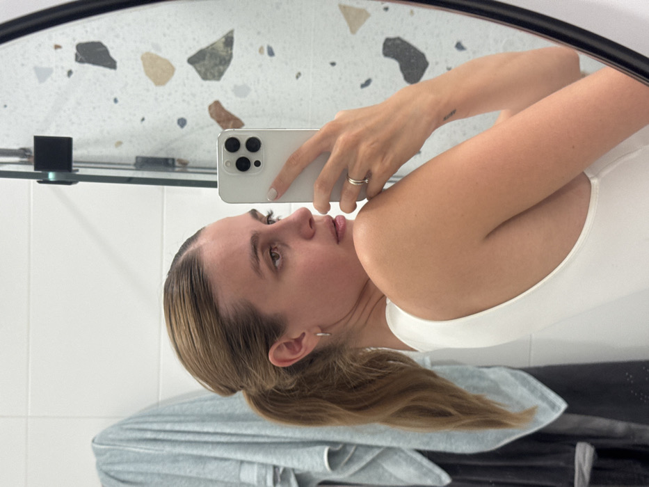 A woman is depicted taking a mirror selfie in what appears to be a bathroom in Tbilisi, Georgia. She has light brown hair tied in a ponytail and is wearing a white sleeveless top. Her left side is visible, with her head turned to look at the reflection of the smartphone in her right hand. A small silver hoop earring is present in her left ear. Her right hand, featuring a thin ring on the ring finger and manicured nails, holds a light-colored smartphone with a triple-lens camera array, positioned to capture the reflection. A faint, indiscernible text tattoo is visible on her inner right forearm. The background to her left shows white tiled walls with a light blue/grey towel draped over a hook. The wall reflected in the oval mirror, which has a black frame, features a light background with a scattered, irregular terrazzo-like pattern in shades of grey, brown, and light blue.