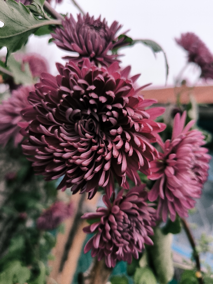 The scene, located in Parkhomivka, Ukraine, presents a close-up, shallow depth of field view of multiple deep magenta-to-plum colored chrysanthemums. A large, fully bloomed chrysanthemum with densely packed, curled petals occupies the central-left foreground. Several other chrysanthemums, rendered out of focus, are visible in the midground and background, primarily to the right and above the primary subject. Green leaves are present, with one partially torn leaf visible in the upper left. The background consists of blurred elements, including a light, possibly overcast sky or distant structure in the upper portion, an indistinct orange-brown horizontal object in the upper right quadrant, and muted teal-blue and dark green areas suggesting distant foliage or architectural features. No human subjects or discernible actions are present.
