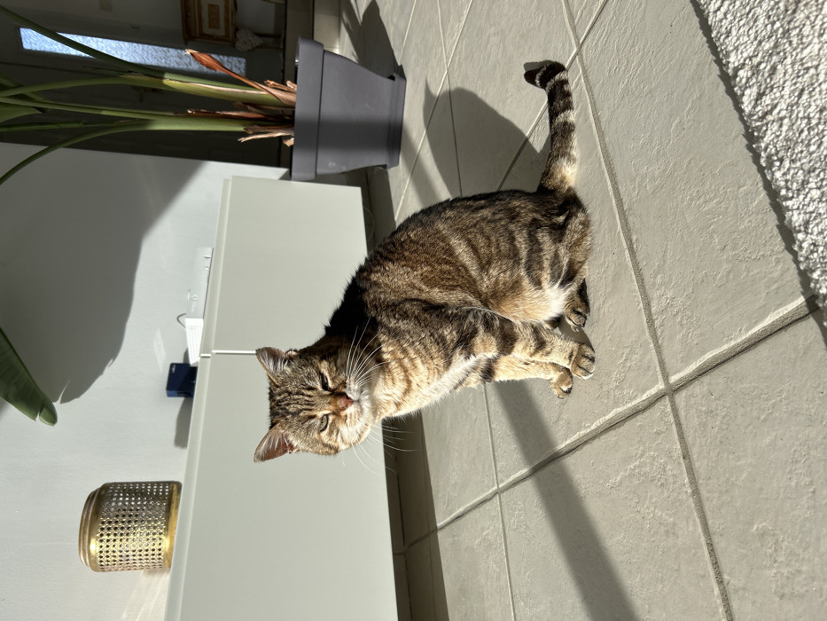 The scene depicts the interior of a residence in Veauchette, France. A domestic short-haired tabby cat, predominantly brown and black striped with lighter underparts, is centrally positioned, sitting upright on light-colored square floor tiles. The cat's eyes are partially closed, consistent with direct sunlight illuminating its left side and face; its right side is in shadow. A small notch is visible on the superior aspect of its left ear. In the background, a white, modular credenza extends along a white wall. Upon the credenza, from left to right, are a gold-toned cylindrical object with a perforated pattern, a small dark blue electronic device, and a rectangular white electronic device. To the right, a large potted plant with broad green leaves is contained within a dark grey square planter, also on the tiled floor. Further right, a partial view of an entrance or doorway with steps and a wall-mounted framed item is discernible. The area is brightly lit by an unseen light source from the left, casting prominent, elongated shadows across the floor and wall, including those of the cat and the plant. A segment of a white shaggy rug is visible in the lower right foreground. No people are present.