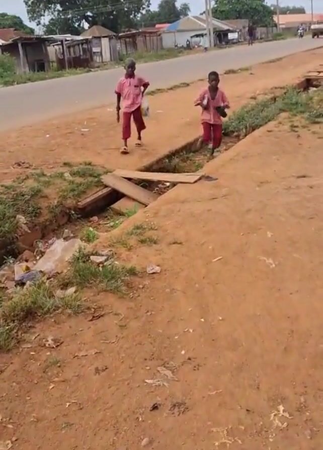 Two young boys in matching red and white outfits walk toward the camera along a dirt path next to a paved road. One boy wears sandals while the other is barefoot. The road is lined with modest buildings and vegetation, suggesting a rural or developing area. A drainage ditch runs between the path and the road, partially covered by wooden planks. The sky is overcast. A motorcycle and several people can be seen in the distance.