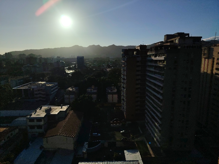 An aerial view of a city landscape bathed in sunlight. High-rise apartment buildings dominate the right side of the frame, contrasting with lower buildings to the left. A mountain range forms the backdrop, silhouetted against the bright sky. The sun, a prominent feature, shines brightly amidst a haze. Urban infrastructure, including roads and buildings, stretches into the distance, partially obscured by shadows and lighting.