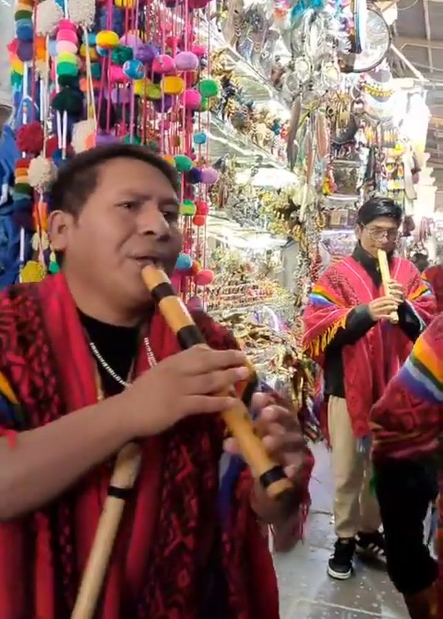 A group of men, wearing colorful ponchos, play wooden flutes in a crowded market. The market stalls are filled with various souvenirs, including dreamcatchers, and colorful decorations. The men are playing in unison, their music filling the narrow aisle of the market. The lighting is bright and overhead.