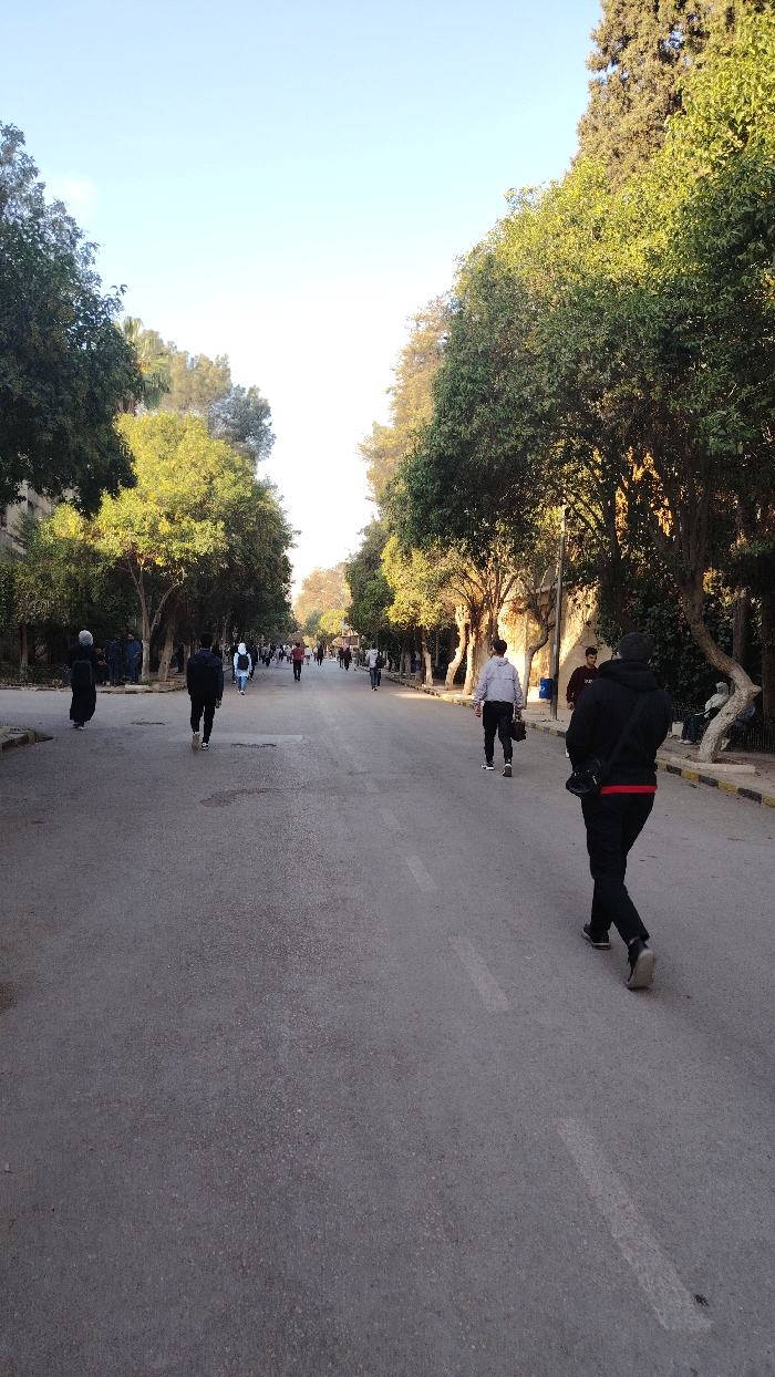 A street scene shows several pedestrians walking along an asphalt road lined with trees. The trees, mostly green, provide shade to the sides of the road. People are scattered along the street, some walking towards the viewer, others away. The sky is pale blue and mostly clear. Buildings can be seen in the distance behind the trees. The road takes up most of the frame, emphasizing the length of the street.