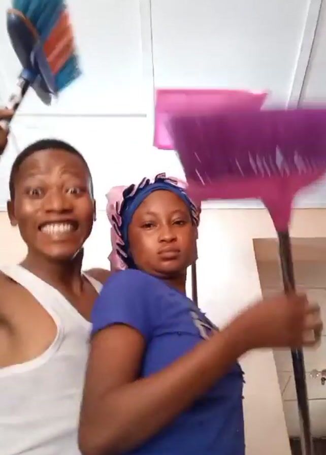 A person wearing a white tank top is smiling at the camera and holding a blue and orange broom high above their head, while a person in a blue shirt and a pink bonnet is holding a purple broom and giving a neutral expression to the camera. Both individuals are in front of a white paneled ceiling. The person in the blue shirt appears to have something in their right hand. They are indoors.