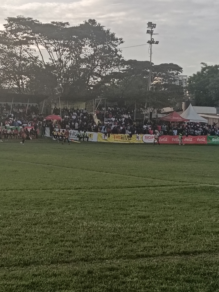 The image displays an outdoor sporting event at the RFUEA Grounds on Ngong Road in Nairobi, Kenya