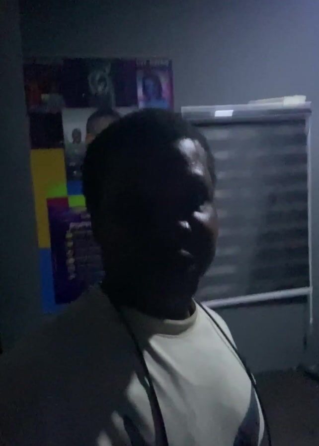 A medium-shot video features a man with dark skin and short black hair