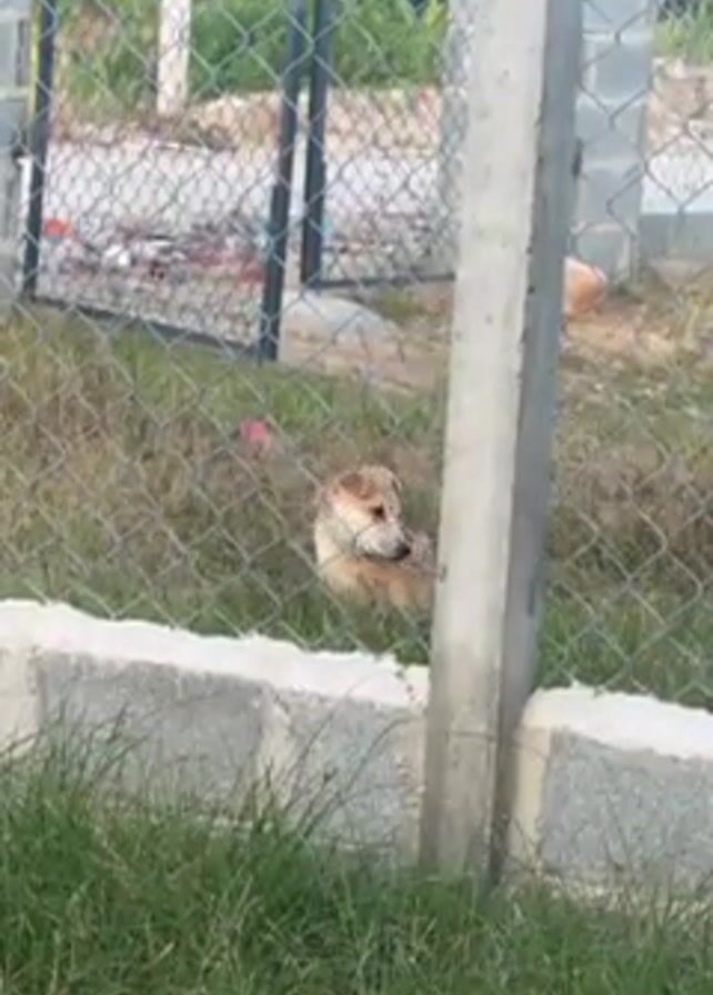 A medium shot shows a small, light brown dog behind a chain link fence. The fence is partially obscured by a gray concrete post and green grass in the foreground. Behind the fence is grass and what appear to be concrete blocks and some miscellaneous items. The dog is sitting, looking at the camera with alert, expressive eyes. A small red object is visible in the background behind the fence. The dog shifts slightly.