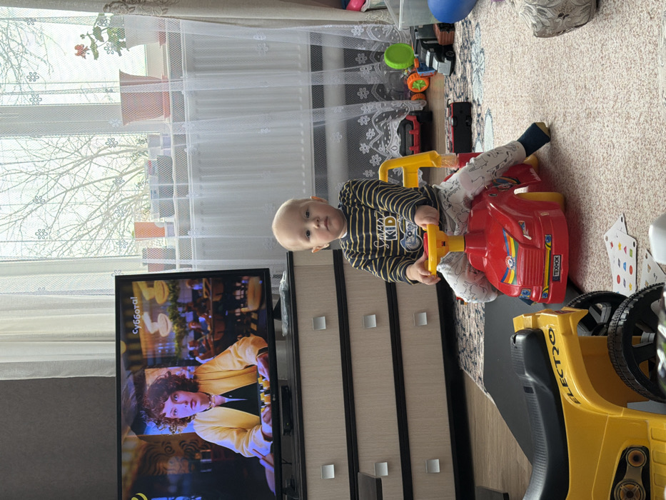 The image captures an indoor residential scene in Alnashi, Russia. A fair-skinned infant, appearing approximately 1-2 years old, with a smooth scalp, is seated centrally on a red plastic ride-on toy car with a yellow steering handle. The infant wears a dark blue and yellow horizontally striped long-sleeve shirt featuring the text "SMART KID" and light-colored patterned pants, with dark socks visible on the feet. The infant faces directly towards the viewer with a neutral expression. In the background, to the left, a large flat-screen television is active, displaying a medium shot of a woman with red, curly hair wearing a yellow blazer over a black top, seated at a table with several small yellow objects in front of her. Russian text, "Суббота!" (Saturday!), is visible in the upper right corner of the television screen. The television rests on a multi-drawer dresser or media console constructed from light-toned wood with darker accents and featuring rectangular silver handles. To the right of the television, a large window is visible, covered by a sheer white curtain with a subtle floral pattern. Through the window, the bare branches of a tree are discernible, suggesting a non-summer season. Multiple potted plants in various colors (pink, white, terracotta) are arranged on the windowsill, above a white radiator. The floor is covered by a light-colored rug with a geometric pattern. Additional toys are scattered on the floor, including a yellow ride-on ATV in the immediate foreground to the left, and various plastic toys, such as a black and orange toy truck, a green ring, and other colorful objects, visible towards the right side of the room. Small, colorful paper cutouts or cards are also visible on the rug near the infant's toy car.