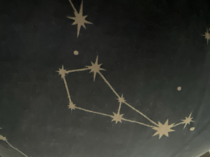 A close-up image displays a dark blue or black textile surface patterned with light beige astrological constellations