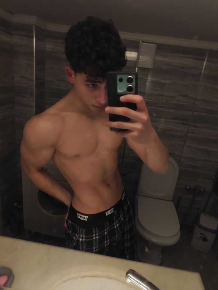 A shirtless young man poses in a bathroom mirror, holding a phone