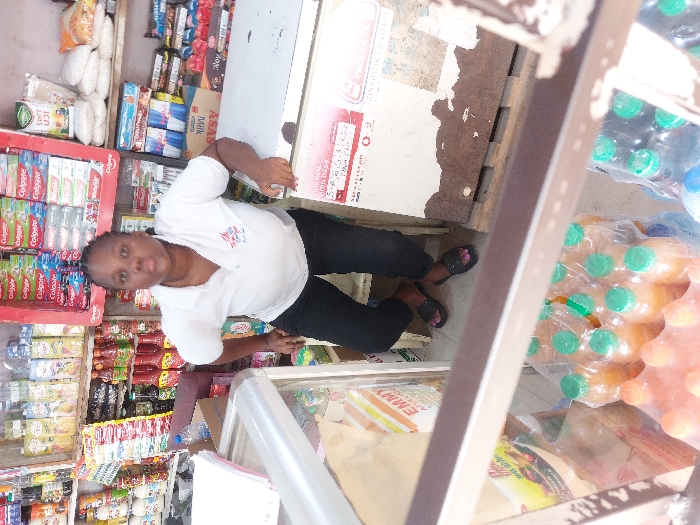 An interior photograph depicts one adult female standing within a densely stocked retail establishment, consistent with a convenience store in Dar es-Salaam, Tanzania