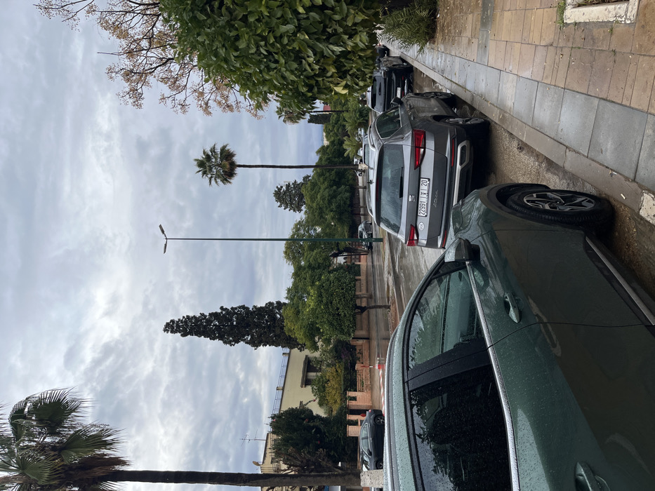 The image depicts a wet street scene in Meknes, Morocco, under an overcast sky. In the foreground, the dark green metallic body of a vehicle, likely an SUV, is partially visible on the left, covered in water droplets. To its right, a grey SEAT Ateca SUV is parked parallel to a wet curb, displaying Moroccan license plate "MA 22991 | 20" on its rear. The asphalt road surface is visibly wet. Further down the street, additional vehicles are parked along both sides, and others are present on the roadway. On the left side of the street, behind a low wall and dense green foliage, residential buildings are visible. Tall palm trees and a slender, dark coniferous tree punctuate the skyline. A tall street lamp stands centrally. A wet, paved sidewalk runs along the right side of the street, bordered by green bushes. No individuals are present in the scene.