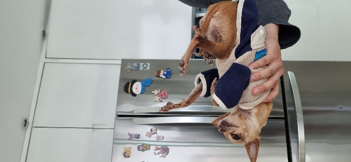 A person is holding a small, tan-colored dog upside down. The dog is wearing a blue and beige garment, likely a sweater or shirt. The background includes a stainless steel refrigerator adorned with various magnets, including a snowman. Adjacent to the refrigerator are white cabinets. The scene appears to be indoors, possibly a kitchen.
