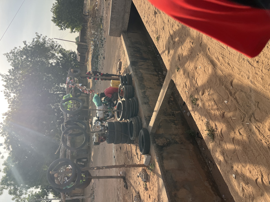 - "This image captures an outdoor, informal motorcycle tire repair and sales setup in Birnin Kebbi, Nigeria, under strong, low-angle sunlight that causes lens flare in the upper left quadrant" by FM-d8Pvz1, licensed under CC BY 4.0