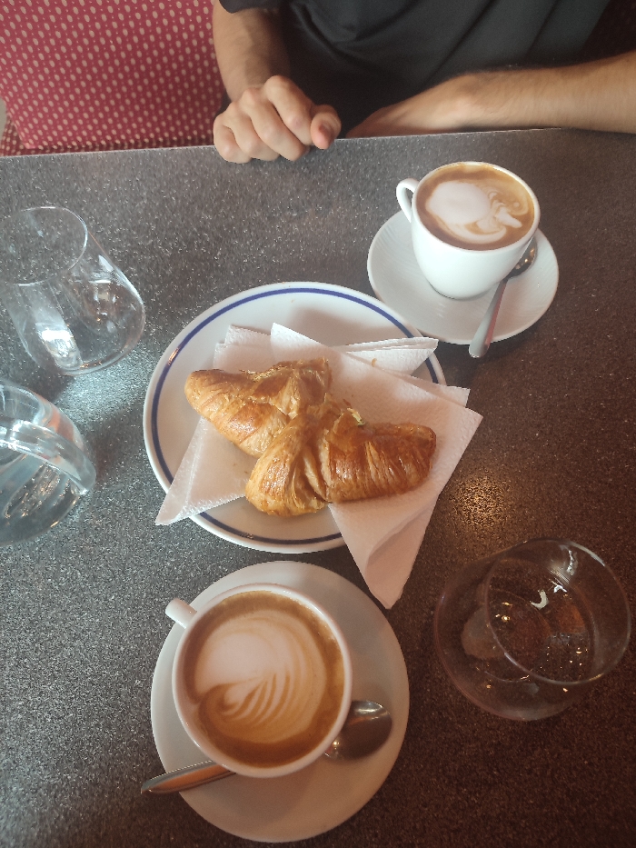 The image depicts a table scene in a cafe in Rovereto, Italy. A speckled dark grey table surface occupies the majority of the frame. Two individuals are partially visible at the top edge; one wears a red garment with white polka dots, the other a plain black short-sleeved shirt, with their forearms and hands resting on the table. Arranged on the table are several items: - Two white ceramic cups with matching saucers and metal spoons. Both cups contain cappuccino, distinguished by latte art: one exhibits a simple swirl, the other a more intricate feather-like pattern. - A white ceramic plate with a blue double-line rim, upon which two golden-brown croissants rest on white paper napkins. - Two clear glass tumblers, one on the far left partially filled with water, and one on the far right which is empty. - A portion of a clear glass carafe or pitcher, also containing water, is visible on the left side of the table. The scene suggests a breakfast or coffee break for two individuals.