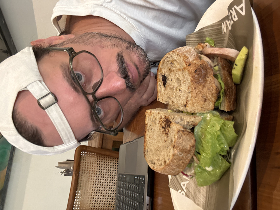 A person wearing glasses and a white baseball cap poses with a sandwich