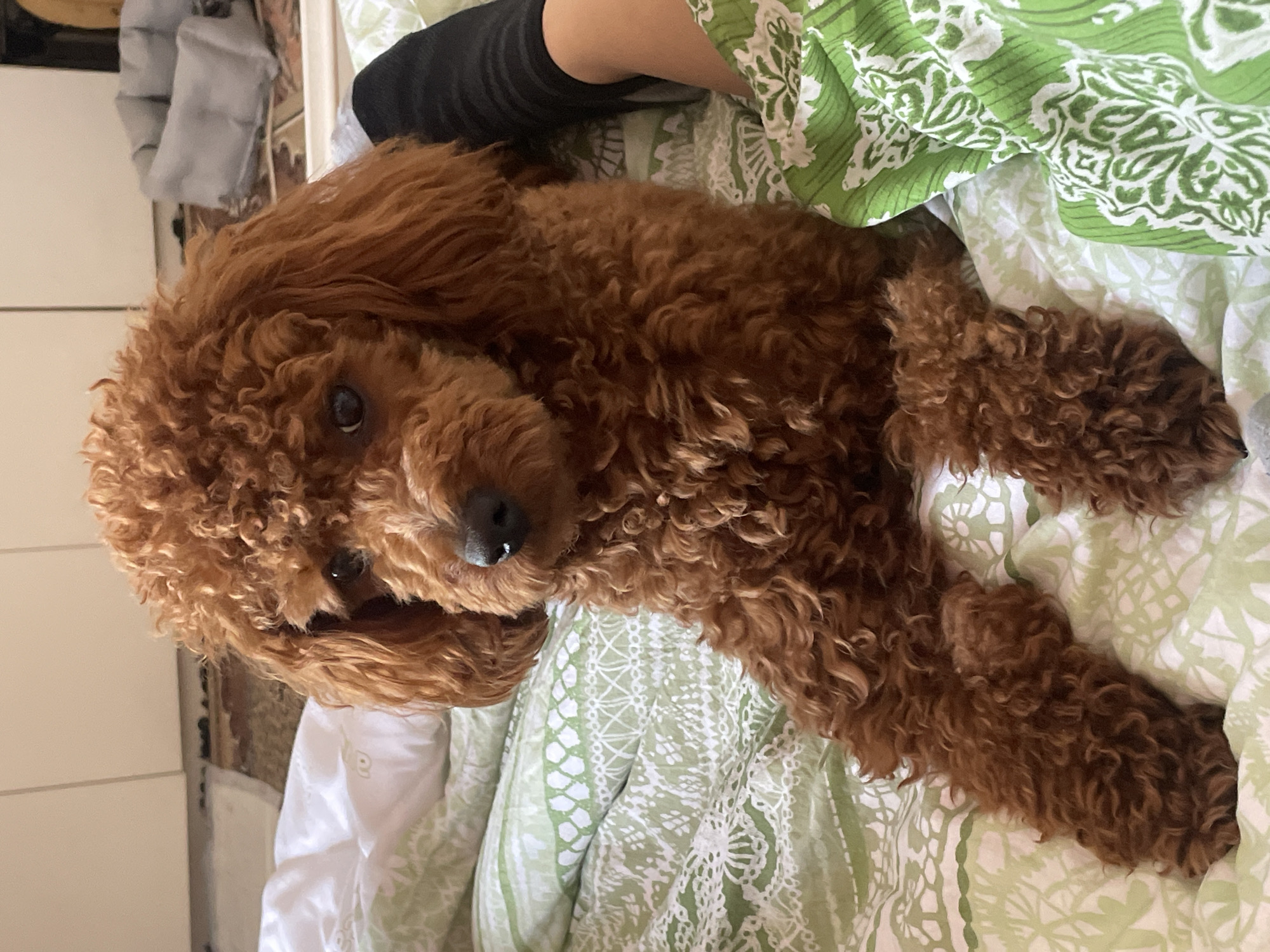 A brown, curly-haired dog is lying on a bed with green and white patterned sheets. A person's leg, wearing a black compression sleeve, is visible near the top of the image. The background shows part of a white wall and possibly a piece of furniture. There is no evidence to suggest this image was taken in Sadovets, Bulgaria.