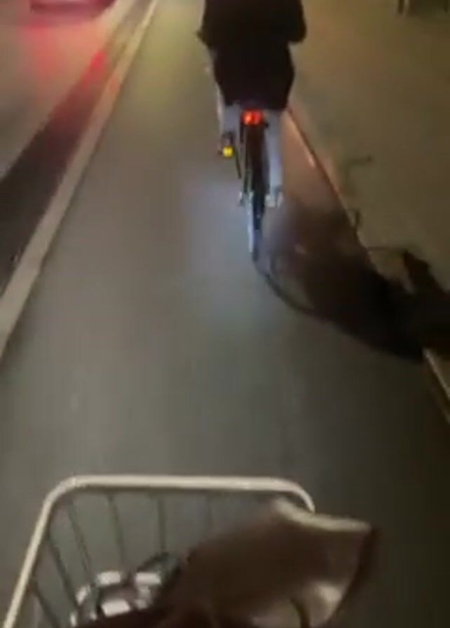 person riding a bicycle at night through a European city. The video is shot from the rider's perspective, focusing on the handlebars and the basket, which contains a brown leather bag. Another cyclist is visible ahead, riding in the same direction. Streetlights illuminate the scene, and passing cars can be seen. The road is paved and lined with buildings on both sides. The cyclist is wearing light-colored pants and a dark jacket.