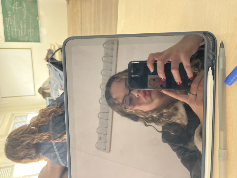 The scene is a classroom located in Burjassot, Spain. In the immediate foreground, a light-colored wooden desk displays a white stylus, a grey pen, and a blue marker cap. A tablet, positioned on the desk, reflects a female individual taking a selfie. This individual, with light brown, wavy hair and wearing glasses, has her lips puckered in a 'duck face' and holds a black smartphone with red-painted nails, a ring on her left ring finger, and an image of a person's face with a dark eye mark on the phone case. The reflection also shows a light-colored wall with a white coat rack featuring five hooks behind the individual. Beyond the tablet, the classroom environment is visible: another person with long, wavy brown hair, wearing a blue denim jacket, is seated at a desk with a laptop. The room features light-colored walls, windows providing natural light, a large white projection screen, and a green chalkboard filled with mathematical equations. The flooring appears to be light-colored wood or linoleum.