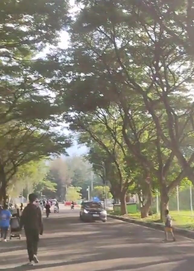 busy street scene, shaded by tall trees that form a canopy overhead. The road is paved with asphalt, with a sidewalk lined by trees and parked motorcycles to one side. Several people can be seen walking along the sidewalk, some are in groups. One person is walking on the street's edge, while cars and motorcycles drive down the road. The area appears to be a park or recreational area. The day seems bright with dappled sunlight filtering through the trees.