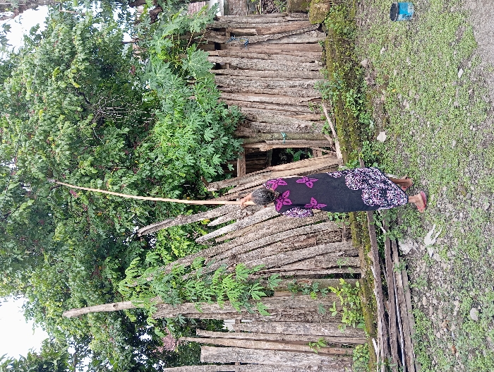 An adult female, seen from behind, is captured in an outdoor setting in Waung, Indonesia. She wears a black long dress or sarong adorned with prominent purple and pink floral patterns and light-colored sandals. The woman stands on uneven ground composed of sparse green vegetation, dirt, and small stones. She holds a long, slender, light-colored wooden pole, extending it vertically into the dense foliage of a large tree, which bears green leaves and small red fruits. This action suggests an attempt to reach or dislodge items from the tree. Behind the individual and the tree stands a rustic barrier constructed from numerous vertically arranged wooden logs and planks. Further in the background, portions of light-colored buildings are discernible on both the left and right sides. On the ground to the lower right, a blue cylindrical container is visible. Several horizontal wooden planks lie stacked at the base of the wooden barrier in the foreground.