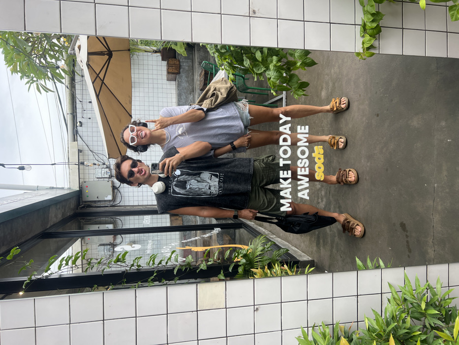 A reflection in a mirror shows two people posing for a picture. The man in the front is wearing a dark shirt and sunglasses, holding his phone, and has headphones around his neck. The woman behind him is wearing a white shirt and sunglasses, with headphones around her neck, and is making a hand gesture. The background features a tiled wall, greenery, an outdoor seating area with an umbrella, and utility equipment. "MAKE TODAY AWESOME SODA" is vertically aligned on the mirror image.