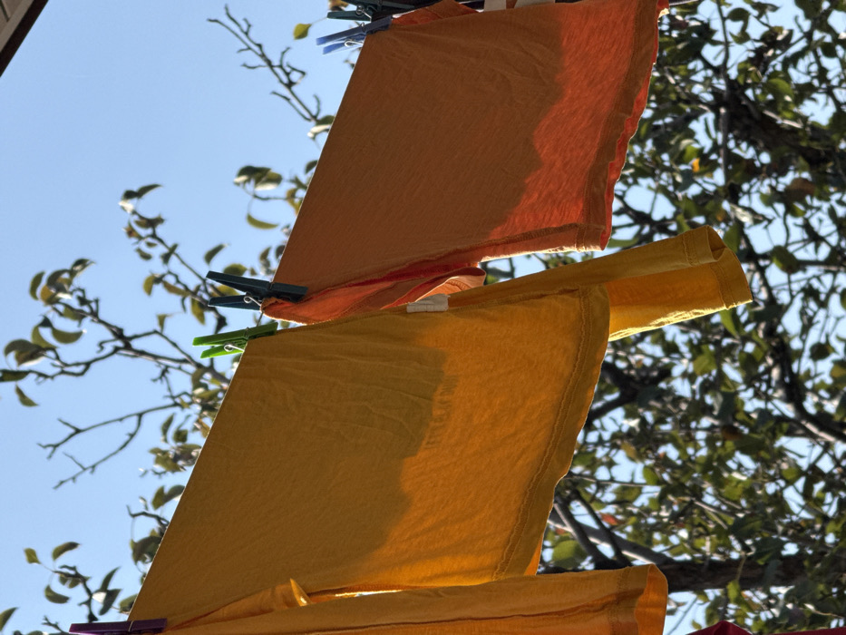 The image depicts an outdoor scene in Armavir, Armenia, showcasing three garments suspended from a clothesline against a natural backdrop. From left to right, a portion of a dark yellow short-sleeved garment is visible, followed by a full bright yellow short-sleeved shirt, and a partially visible orange short-sleeved shirt. Each garment is secured to an unseen clothesline by plastic clothespins: the leftmost yellow garment by a purple clothespin, the central bright yellow shirt by a green clothespin on the left and a dark blue clothespin on the right, and the orange shirt by a light blue clothespin. The bright yellow shirt displays a small white fabric label on its upper left side. The fabric of all visible garments exhibits a fine texture and slight creasing. Strong, direct sunlight from the upper left casts distinct shadows across the lower sections of the yellow and orange shirts. The background consists of out-of-focus tree branches with scattered green leaves, silhouetted against a clear, light blue sky.