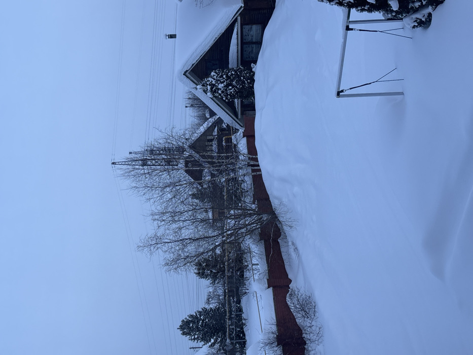 A snow-covered landscape featuring a building with a steeply pitched roof laden with snow. A bare tree stands in the foreground, with a lattice tower behind. Power lines stretch across the sky. A brick structure, potentially a wall, is visible along with a table completely buried under snow, indicating heavy snowfall.