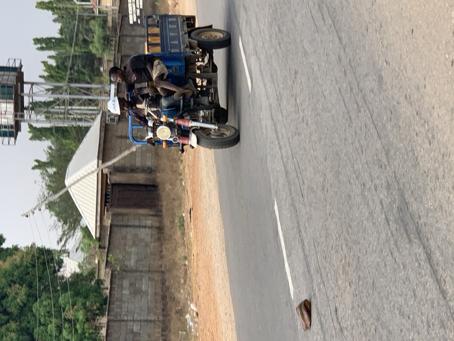Two people are riding a blue three-wheeled vehicle on a paved road. The driver wears a black shirt and tan shorts, while the passenger is wearing a white top. A water tower stands in the background, along with a low building and trees. A flip-flop lies on the road. The scene appears to be in a rural or suburban setting.