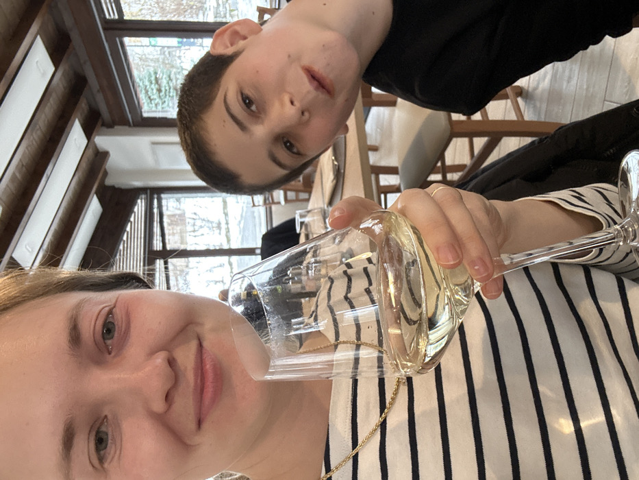 An indoor scene in a restaurant in Bellagio, Italy, features two individuals. In the foreground, a light-skinned adult female with light brown hair, wearing a white shirt with black horizontal stripes and a gold chain, holds a stemmed glass containing a clear, light yellow liquid (consistent with white wine) in her right hand. She is smiling faintly, looking directly at the camera, and a minor reddish mark is present below her left eye. To her right, in the mid-ground, a light-skinned pre-teen or teenage boy with short dark hair and wearing a dark shirt, looks towards the camera with a slight smile and a tilted head. A light residue is visible on his lower lip. The background shows a restaurant interior with light-colored walls, exposed wooden ceiling beams, and large windows revealing an outdoor scene. Outside, bare deciduous trees and a conifer are visible against what appears to be a cold or wintery landscape with some light ground cover, possibly snow or frost, and a paved surface. Wooden tables are set with white plates and glasses, and wooden chairs with light gray upholstered seats are visible in the dining area.