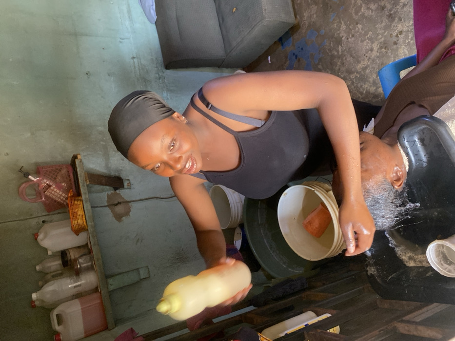 This image captures an indoor scene, likely a modest hair salon or a home-based hair care setup, located in Jos, Nigeria. A young adult female, identified as the hairstylist, with dark skin and wearing a black tank top and a black headwrap, stands in the foreground, facing towards the lower left. She holds a light yellow, opaque plastic bottle, possibly containing shampoo or conditioner, in her outstretched right hand, positioned above the head of a client. Her left hand is also active, presumably massaging the client's hair. Her mouth is slightly open, suggesting she is speaking or in mid-conversation. Beneath the hairstylist's hands, a client's head is visible, tilted backward into a black, portable washbasin. The client's dark hair is wet, lathered with suds, and water is actively dripping into the basin. The client is partially covered by a brown cloth or blanket. A blue plastic chair is partially visible behind the client. The immediate environment includes: * Several plastic buckets on the floor: a large dark green bucket behind the stylist, a white bucket containing an orange object (possibly a bar of soap or sponge) beside it, and another white container near the washbasin. * Walls: The walls are painted a faded light blue or greenish hue, showing signs of wear and some discoloration. * Shelf: A rudimentary wooden shelf is mounted on the left wall, holding various plastic containers of different sizes (some clear, some opaque, containing liquids), a pink woven basket, and a smaller orange woven basket. A white pump bottle is visible within the pink basket. * Furniture: A section of a dark grey upholstered sofa or bench is visible in the background on the far right. * Floor: The floor appears to be concrete, exhibiting dark, wet patches, suggesting water spillage. The scene depicts the action of hair washing in progress.