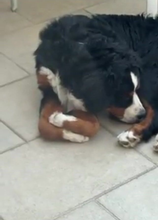 A medium shot shows a Bernese Mountain Dog lying on the floor