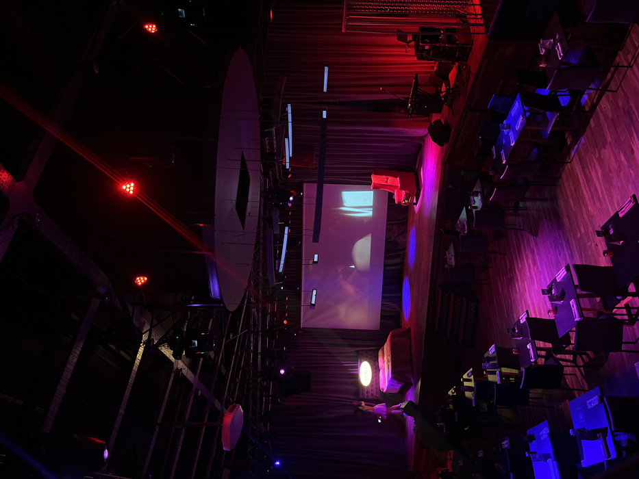 A rotated view of an event space with red and blue lighting. A large oval structure hangs from the ceiling, alongside rectangular light panels. A screen displays a partially visible image. Rows of chairs face the stage area, which includes furniture and decorative lights. The scene is a mix of industrial architecture and theatrical lighting, creating a dynamic and atmospheric environment.