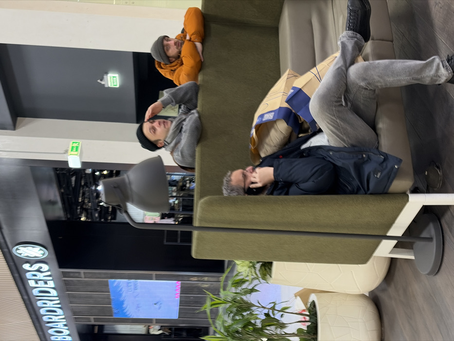 The scene is an indoor commercial space, likely a shopping mall, in Kudrovo, Russia, with a "BOARDRIDERS" store facade visible in the background. Three adult males are present, seated on an olive-green upholstered modular bench with high backrests. In the foreground, a man with grey hair and spectacles, wearing a dark blue jacket, light grey jeans, and black shoes, sits with his legs crossed. He holds a black smartphone to his right ear, engaged in a phone call. A large kraft paper bag with blue handles rests on the bench next to him. Behind this man, partially obscured by the bench's high back, two other men are seated. The man on the left wears a black beanie, a grey patterned sweater, and a light grey scarf; his left hand is raised to his forehead. The man on the right wears a grey beanie and an orange puffer jacket, with his arms resting on the backrest. A dark grey floor lamp with a bell-shaped shade stands in front of the seating unit. To the left, two potted green plants in white, textured planters are visible. Green illuminated emergency exit signs are mounted on the dark wall above the "BOARDRIDERS" store entrance. The floor is dark brown and polished.