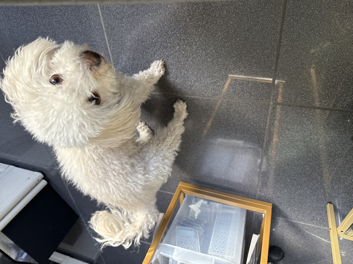 - "A small, white, curly-haired domestic canine, consistent with a Poodle or Poodle mix, stands on a dark gray speckled tiled floor, occupying the central-right area of the frame" by FM-POwo32, licensed under CC BY 4.0