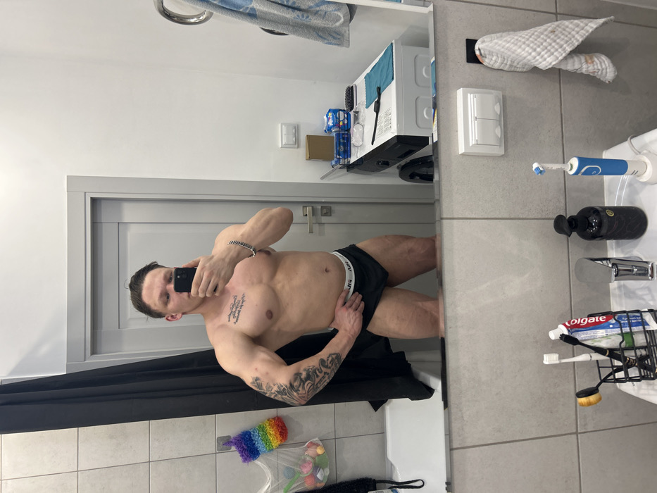 A man stands in a bathroom, posing in front of a mirror, holding a phone and taking a selfie. He is wearing black underwear. His muscular physique, with tattoos on his arms and chest, is prominent. The bathroom includes a sink with toiletries, a washing machine, a white door, and a black curtain. The image is taken at an angle, making the scene appear slightly sideways.
