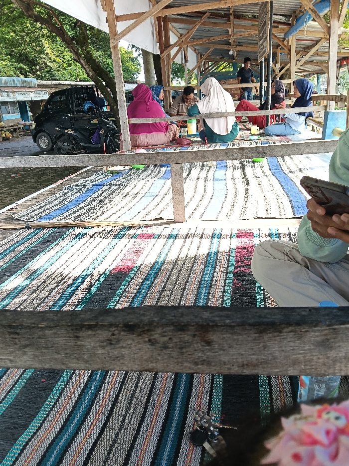 The scene depicts an outdoor or semi-outdoor communal area in Gembong, Indonesia, structured with visible wooden posts and beams supporting a partial roof of white fabric and corrugated metal sheets. The floor is covered with multiple striped mats of varying colors, including blue, white, black, red, and green. In the immediate foreground, the lower body of an individual is visible, seated on a multi-colored striped mat. This person wears light-colored cargo pants with a blue accent on the right thigh and a light green long-sleeved top. Their hands are occupied holding a dark-colored smartphone. A set of silver keys and a blurred pink object are on the mat near their feet. In the midground, five individuals are seated directly on various patterned mats. From left to right: an individual in a bright pink hijab and matching top, an individual in a blue patterned hijab, a male in a striped polo shirt, an individual in a light cream hijab with a dark green top (facing partially away), and an individual in a dark blue hijab with a light blue top. Small plastic containers (green, yellow, red) are positioned on the mats in front of them, suggesting a meal or social gathering. A clear plastic water bottle is also visible on the mat. In the background, a black mini-truck is parked, with a black scooter positioned in front of it. Beyond these vehicles, a street is visible, and piles of coconuts are present on the ground near buildings, one featuring a blue facade. Further within the wooden structure, another male individual wearing a dark t-shirt stands. The environment is illuminated by natural daylight.