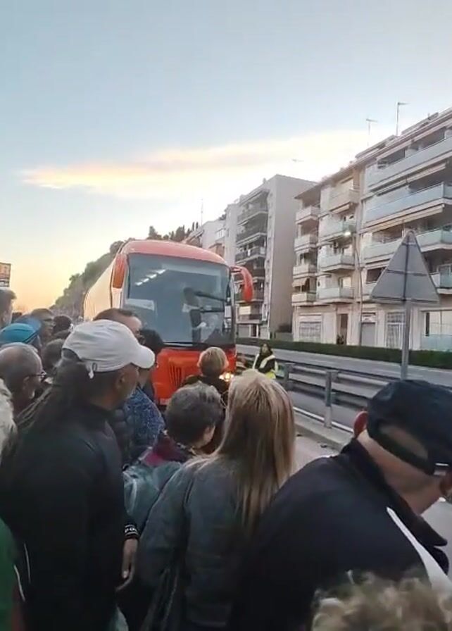 crowd of people waiting to board a large, orange bus on the side of a road in a city. The bus, marked with "Moventis," is stopped on the street with its lights on. A person in a yellow safety vest is standing near the front of the bus, appearing to manage the boarding process. Buildings line the other side of the street, and the sky is a mix of blue and orange, suggesting it's either early morning or late afternoon. Several individuals in the crowd are looking towards the bus, and some are carrying bags, indicating travel.