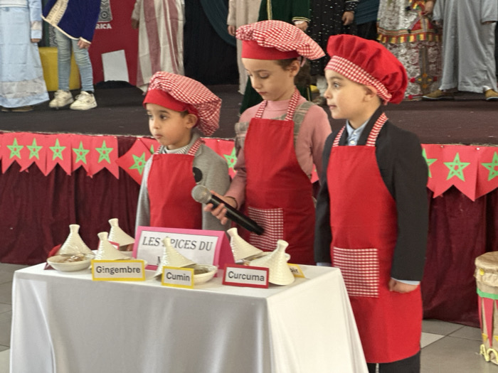 An indoor scene depicts three young children, dressed in red chef hats with white checkered trim and red aprons, standing behind a white-draped table. The child on the left wears a grey long-sleeved shirt, the middle child a light pink shirt, and the rightmost child a dark suit jacket over a light blue collared shirt. The middle child holds a black microphone in his right hand. On the table, several small white bowls contain spices, each topped with a small, white tagine-shaped cover. Yellow labels identify "Gingembre" (Ginger), "Cumin," and "Curcuma" (Turmeric). A white sign with a pink border on the table reads "LES ÉPICES DU" (The Spices of the...). Behind the children, an elevated platform or stage features a red fabric backdrop adorned with a banner of red triangular flags, each displaying a green five-pointed star, consistent with the Moroccan flag motif. Several adults and potentially other children are visible standing on this platform in the background, some wearing traditional Moroccan attire. To the far right, part of a traditional drum, decorated in red and green, is visible. The flooring appears to be light-colored tiles. The specific location within the city of Salé, Morocco, cannot be determined from the visual information provided in the image.