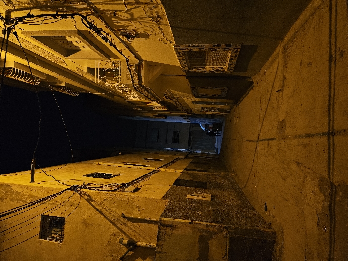 The image displays a narrow urban alleyway at night in Fez, Morocco, illuminated by a warm, yellow artificial light source, casting long shadows. The alley is flanked by two multi-story buildings, their facades varying in color from yellow to dark gray/green. The building on the left exhibits a rough-textured lower section transitioning to a smoother, lighter upper wall. A single barred window is visible on an upper floor, and numerous black electrical wires are densely strung along the facade, extending across the alley overhead. The building on the right features multiple windows, some with decorative metal grilles, and a small white-railed balcony projecting from an upper floor. The lower portion of this building also has a darker, possibly tiled or painted, finish, with patterned surrounds on some window frames. Similar to the left, extensive black electrical wiring is affixed to its facade. The ground surface of the alley appears to be paved with concrete or asphalt, showing visible cracks and linear markings. Towards the distant end of the alley, a faint, dark silhouette of a single individual is discernible, positioned near what appears to be a small, light-colored wheeled cart or structure. The overall scene is devoid of other discernible human activity or specific objects in the immediate foreground.