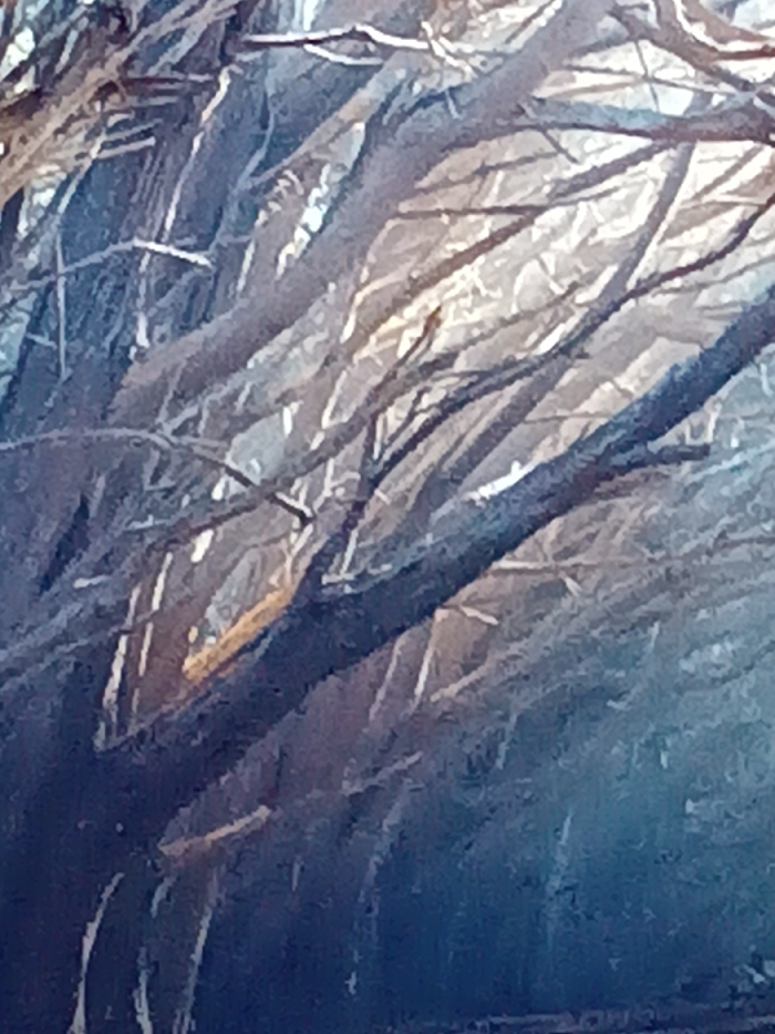 A dense network of bare tree branches dominates the frame. The branches are varying shades of gray and brown, and they intertwine in a chaotic pattern. Sunlight filters through the branches, creating patches of light and shadow. The overall effect is one of stark beauty.
