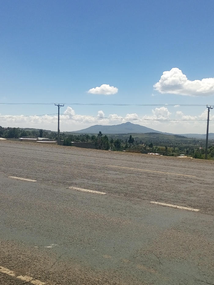The image depicts a rural-urban landscape in Hells Gate ward, Kenya, under a clear blue sky with scattered white cumulus clouds. The foreground is dominated by a grey asphalt road, presenting a slight incline from left to right, with two parallel sets of white dashed lane markings visible. No people, vehicles, or animals are present on the road or in the immediate vicinity. In the mid-ground, two dark utility poles, one on the left and one on the right, are visible, connected by overhead power lines stretching horizontally across the frame. Below these lines, the terrain slopes downwards, revealing a valley or lower plain. Scattered green trees and brush are interspersed with what appear to be distant, low-rise structures and buildings, possibly indicative of a settlement. A light-colored retaining wall or barrier is partially visible along the edge of the road on the left side. The background features a large, prominent mountain with undulating peaks and ridges, positioned centrally under the horizon. The mountain appears relatively arid or sparsely vegetated on its upper slopes. The overall environment suggests a sunny day with good visibility across the landscape.