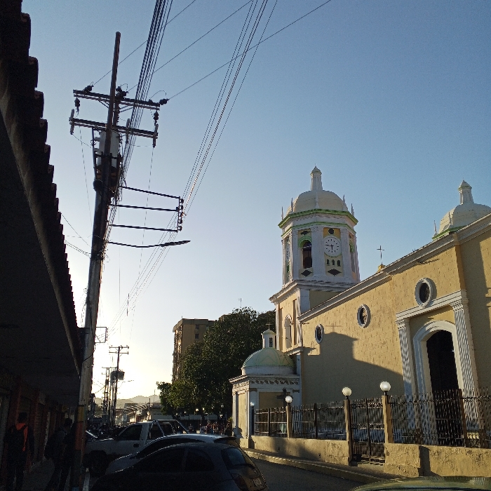 A street scene features a church with a clock tower and domes, painted in yellow and white with green trim. An electrical pole with wires dominates the left foreground. Buildings line the street on the left, while a black iron fence separates the church from the street. Cars and people are visible along the street. The sky is a clear blue, with a hint of sunrise or sunset.